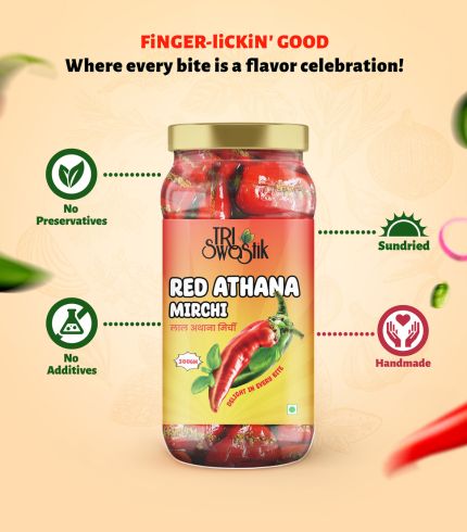 Tri Swastik Foods. Homemade Red Athana MirchiĀ (ą¤ą¤°Ā पर बना लाल ठऄाना ą¤®ą¤æą¤°ą„ą¤ą„):Ā a spicy pickle made from long, fleshy red chilies stuffed with spices and dried mango powder.Ā “Red Athana Mirchi, also known as Bird’s Eye Chilli.